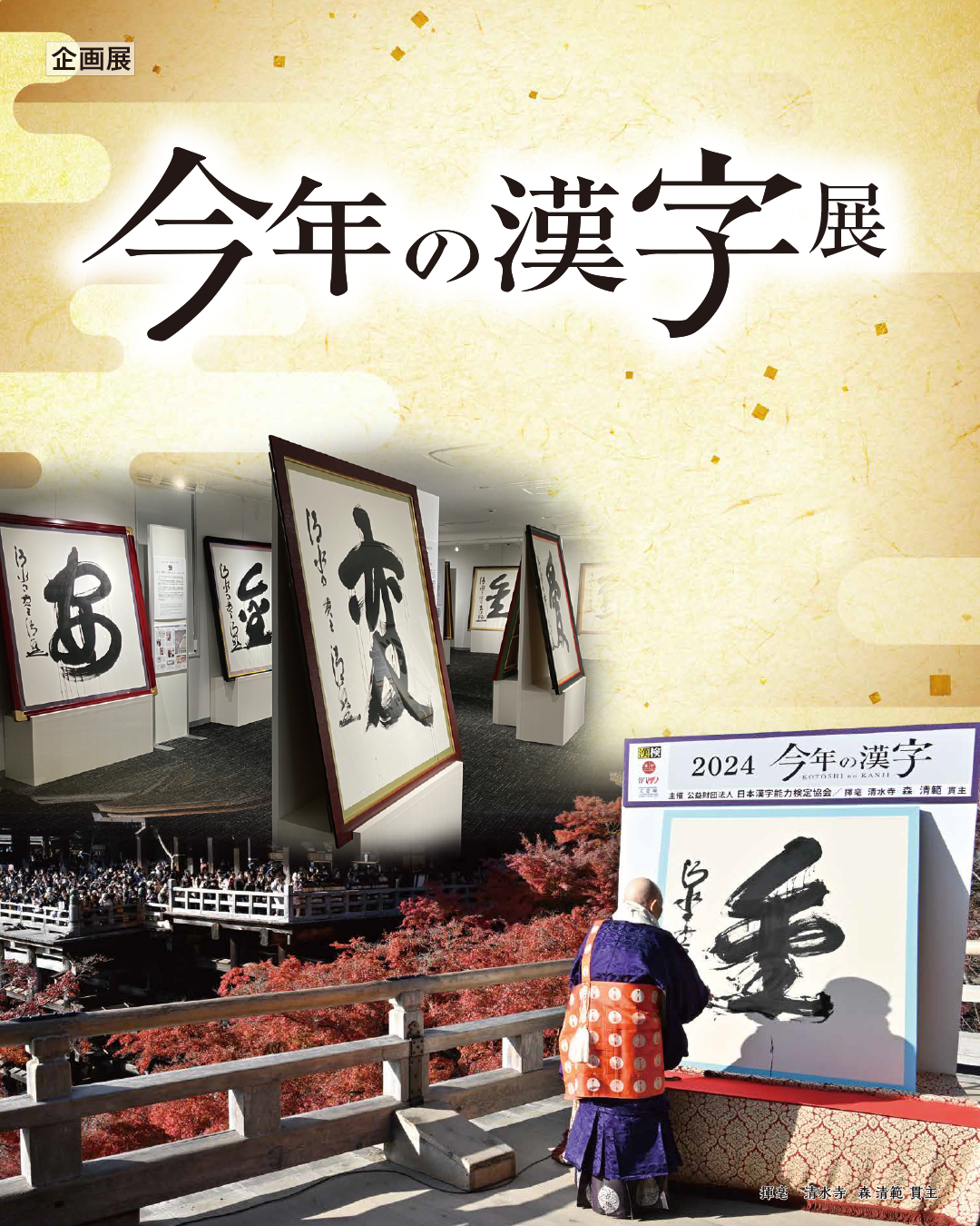 企画展示 2025年度 開催中企画展「最高の景色を」~JFA × 漢検~ 期間 2025年10月30日(木)~2026年7月20日(月祝) 詳細を見る 開催中企画展「今年の漢字展」 期間 2025年10月21日(火)~2026年2月23日(月) 詳細を見る 開催終了企画展「かぶる漢字 -WEARABLE KANJI-」 期間 2025年5月20日(火)~9月28日(日) 詳細を見る 開催終了企画展「妖怪漢字 魑魅魍魎 百鬼夜行」 期間 2025年5月29日(木)~10月13日(月・祝) 詳細を見る 2024年度 開催終了企画展「漢字で感じる色めぐり」 期間 2024年10月29日(火)~2025年5月6日(火) 詳細を見る 開催終了企画展「今年の漢字展」 期間 2024年10月16日(水)~2025年2月24日(月)→期間延長につき2025年5月6日(火祝)まで開催 詳細を見る 開催終了企画展「漢字水族館」 期間 2024年5月28日(火)~2024年9月29日(日) 詳細を見る 開催終了企画展「漢字で『ほっ』~南久美子の遊墨マンガ~」 期間 2024年4月11日(木)~2024年6月30日(日) 詳細を見る 2023年度 開催終了企画展『今年の漢字®展』 期間 2023年10月24日(火)~2024年2月25日(日) 詳細を見る 開催終了企画展『漢字鉄道の旅』 期間 2023年7月19日(水)~2023年10月1日(日) 詳細を見る 開催終了企画展『所蔵品紹介 中国と日本の古辞書展』 期間 2023年4月29日(土)~2023年10月1日(日) 詳細を見る 2022年度 開催終了企画展『今年の漢字®展』 期間 2022年10月19日(水)~2023年2月26日(日) 詳細を見る 2021年度 開催終了企画展『今年の漢字®展』 期間 2021年10月27日(水)~2022年2月13日(日)→期間延長につき2022年4月10日(日)まで開催 詳細を見る 開催終了『なやみ深き漢字学習展―戦後から現代へ―』 期間 2021年6月16日(水)~10月3日(日)→期間延長につき2022年3月31日(木)まで開催 詳細を見る 2020年度 開催終了企画展『今年の漢字®展』 期間 2020年10月21日(水)~2021年1月31日(日) 詳細を見る 開催終了企画展『なやみ深き漢字学習-明治から戦前へ-』 期間 2020年6月3日(水)~2021年1月5日(火) ※新型コロナウイルスの感染防止のため、期間を変更して開催します 詳細を見る 2019年度 開催終了企画展『カンジムジカ』春と愛と漢字に溺れる、音とアートの企画展 期間 2020年1月10日(金)~4月5日(日) 詳細を見る 開催終了企画展『今年の漢字展』~今年の漢字25周年~ 期間 2019年10月8日(火)~2020年2月16日(日) 詳細を見る 開催終了企画展『フォントのホント展』 期間 2019年10月1日(火)~2020年1月5日(日) 詳細を見る 開催終了企画展『漢字で忍者修行』 期間 2019年7月2日(火)~2019年9月29日(日) 詳細を見る 開催終了企画展『名づけの「へぇ~」展』 期間 2019年4月9日(火)~2019年6月30日(日) 詳細を見る 2018年度 開催終了企画展『漢ジム!トレーニング』 期間 2018年12月11日(火)~2019年4月7日(日) 詳細を見る 開催終了企画展『今年の漢字展~平成を漢字一文字でふりかえる』 期間 2018年10月10日(水)~2019年2月11日(月・祝) 詳細を見る 開催終了企画展『幕末明治のことば展~漢字よ、ありがとう』 期間 2018年9月11日(火)~12月9日(日) 詳細を見る 開催終了企画展『漢字の宝島大冒険』 期間 2018年7月10日(火)~9月2日(日) 詳細を見る 開催終了『身近なことばの意外な由来展』~江戸時代の漢字語~ 期間 2018年4月17日(火)~7月1日(日) 詳細を見る 2017年度 開催終了 『今、あなたに贈りたい漢字』展 期間 2018年1月23日(火)~4月8日(日) 詳細を見る 開催終了 『今年の漢字®』展 期間 2017年10月11日(水)~2018年2月12日(月・祝) 詳細を見る 開催終了 『東アジアにおける漢字のあゆみ』展 期間 2017年9月26日(火)~11月19日(日) 詳細を見る 開催終了 『漢字恐怖の館』~本当は怖い、漢字の成り立ち・・・~ 漢字縁日第2弾 期間 2017年7月15日(土)~9月2日(日) 詳細を見る 2016年度 開催終了『みんなの創作"感"字展』~私たちは昔から漢字遊びが好きだった~ 期間 2017年3月22日(水)~6月18日(日) 詳細を見る 開催終了『今年の漢字®』展 期間 2016年10月1日(土)~2017年1月29日(日) 開催終了『漢字縁日』 期間 2016年6月29日(水)~9月30日(金)