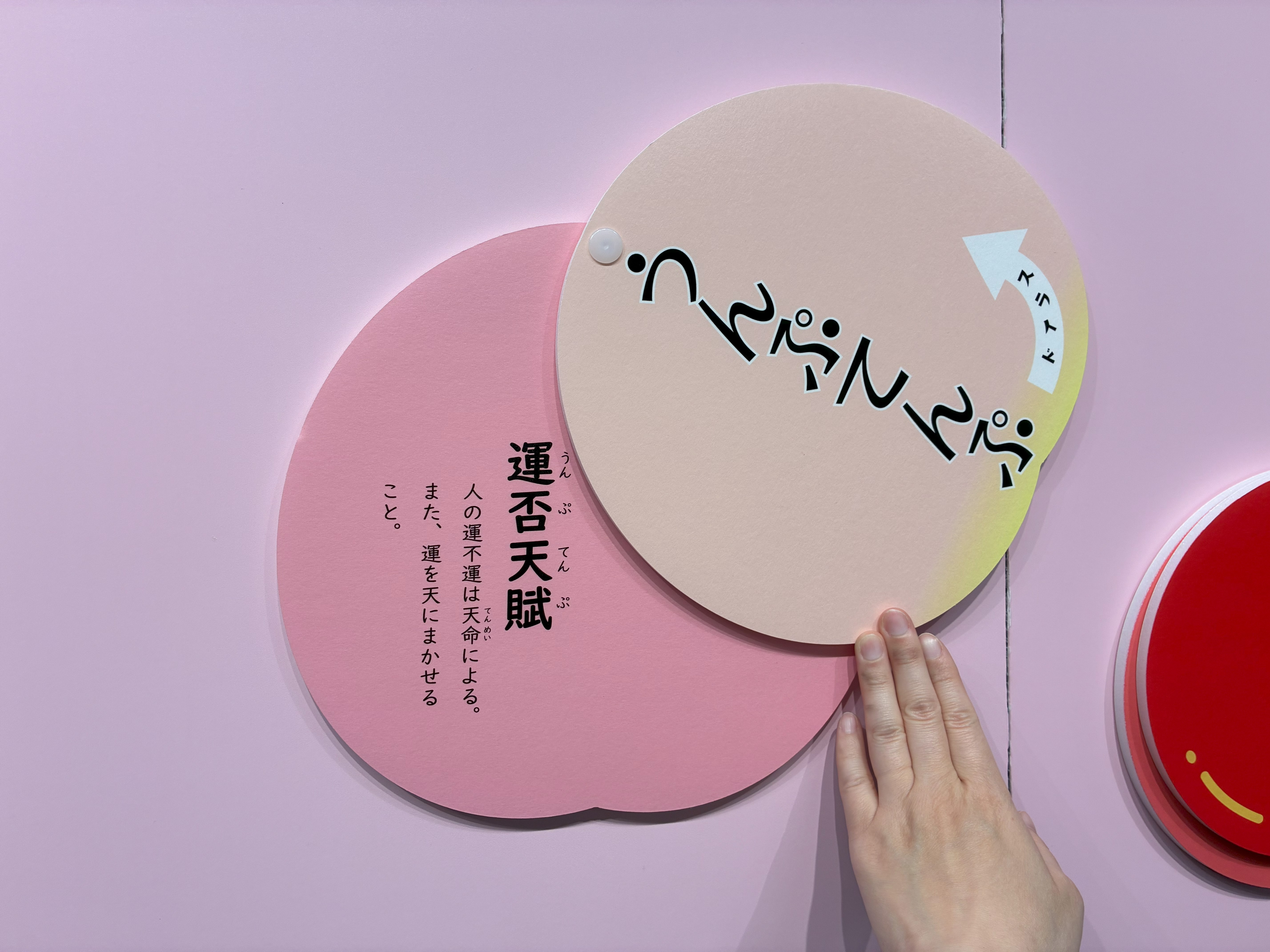 フルーツ型パネルをスライドすると漢字と意味が現れる「音がおもしろい四字熟語」
