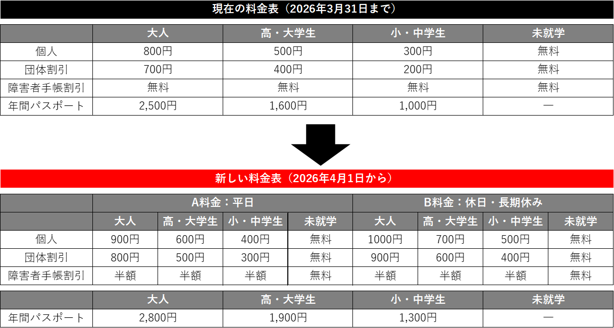 当館は開館当初の2016年6月からこれまで入館料を据え置いて運営してまいりましたが、昨今の物価の上昇に伴う仕入資材や光熱費の値上げ等を受け、2026年4月1日から入館料を以下のとおり改定いたします。